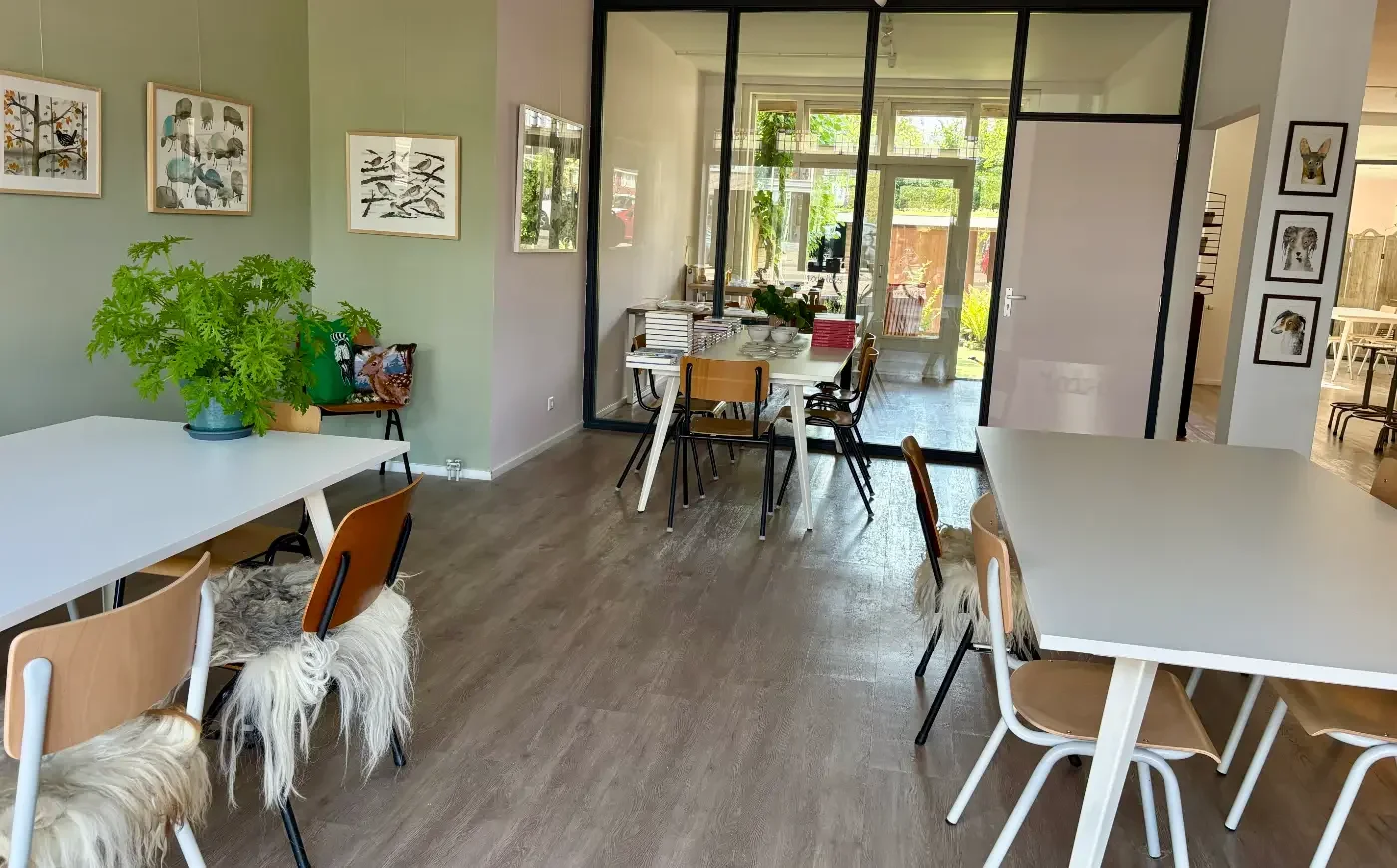 Studio Haas en Hert is een gezellige en sfeervolle ruimte. Er is genoeg plek om gezellig samen te tekenen, maar er is ook ruimte om je terug te trekken in je eigen tekenbubbel.