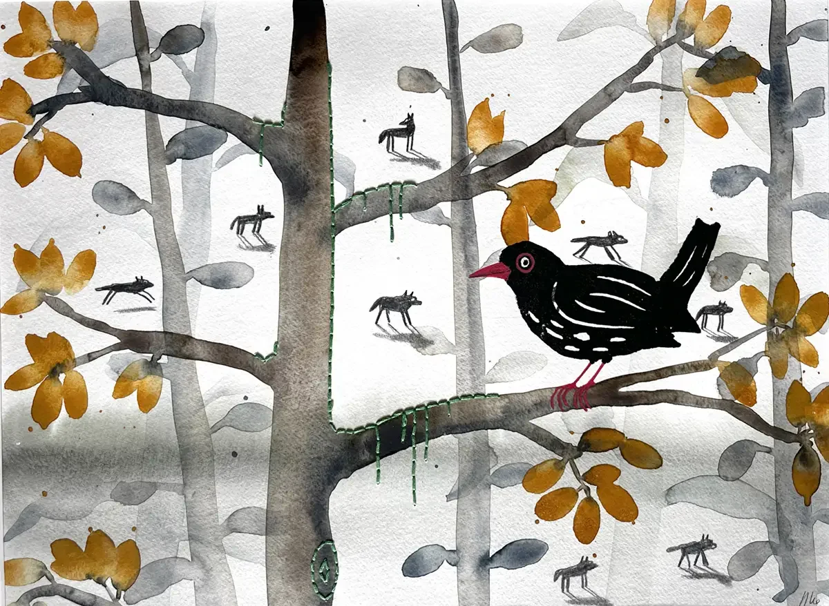 Blackbird and the Wolves. 30 x 40 cm. 2025. Watercolour, Pencil, Lino-print and Embroidery on Paper.