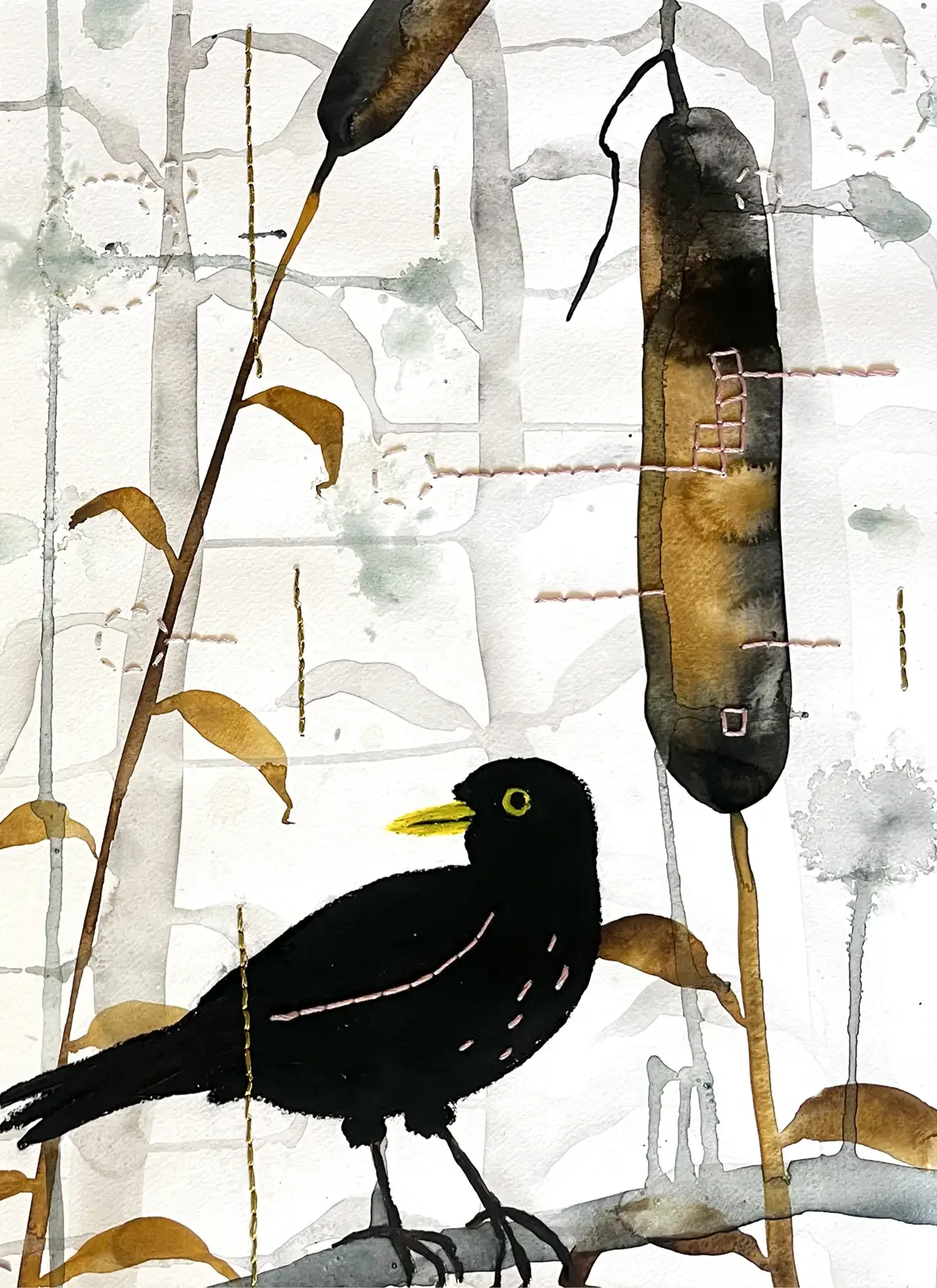 Blackbird. 30 x 40 cm. 2023. Watercolour, Acrylic and Embroidery on Paper