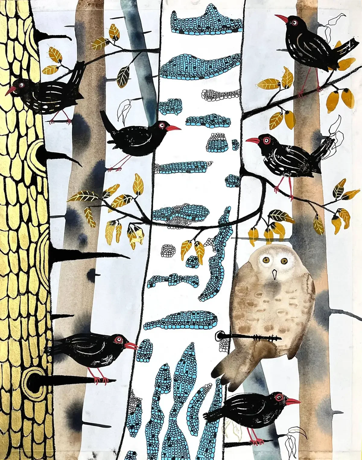 The Owl and the Blackbirds. 50 x 65 cm. 2025. Aquarel, Lino-print, Acrylic and Crayon on Paper. SOLD