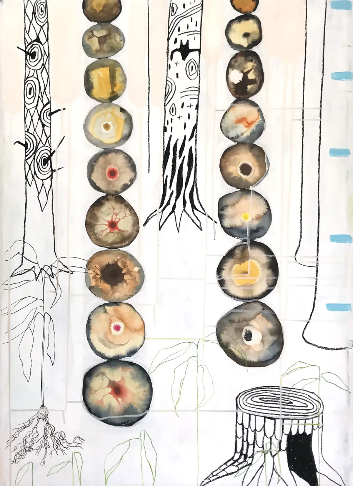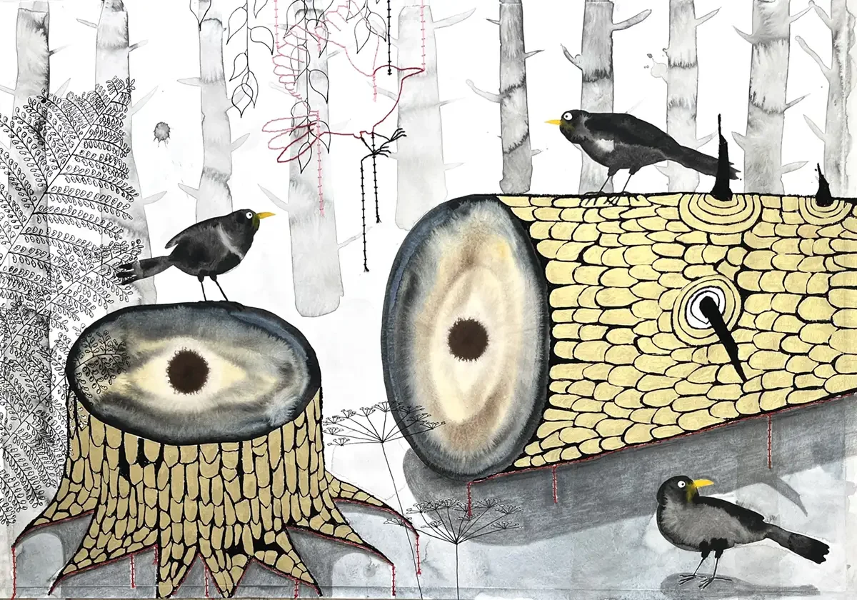 The Felled Tree. 100 x 70 cm. 2025. Aquarel, Acrylic, Crayon, Pencil, Ink and Embroidery on Paper.