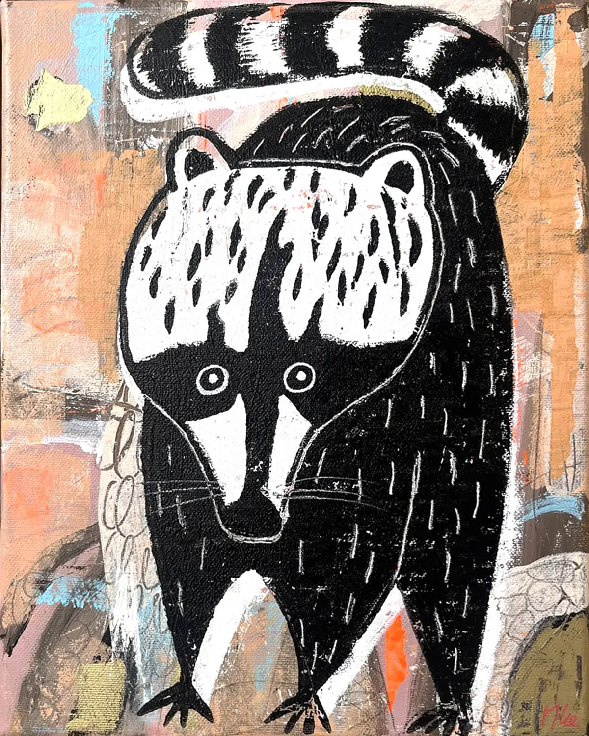 Racoon. 20 x 24 cm. 2025. Acrylic and Lino-print on Canvas.