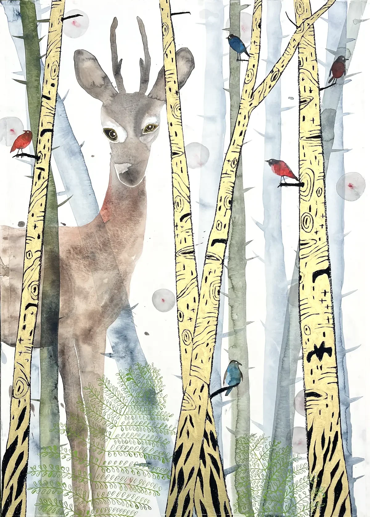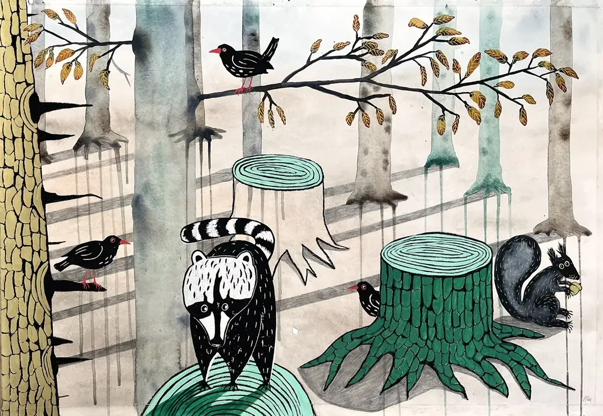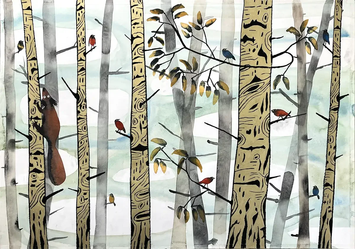 Into the Forest, Squirrel. 100 x 70 cm. 2025. Aquarel, Acrylic and Crayon on Paper.
